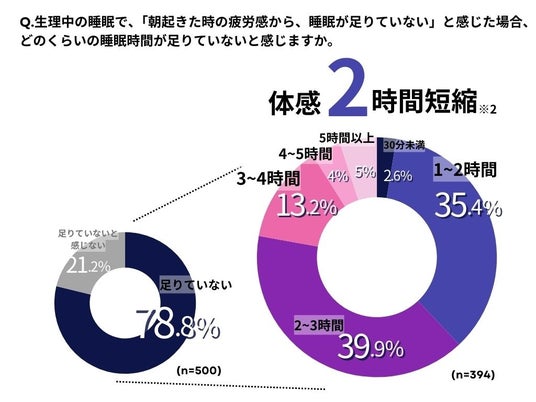 生理中の睡眠不足を感じる女性は約8割にのぼり、約半数が「生理中は睡眠時間が2時間以上足りていない」と回答しました。これにより、生理中の女性における睡眠の質に関する課題が明らかになりました。
