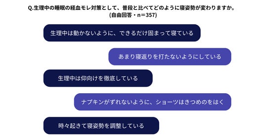 生理中の寝姿勢として「あまり寝返りを打たないようにしている」「ナプキンがずれないように、きつめのショーツをはく」など、普段とは異なる対策をしているという声が寄せられました。