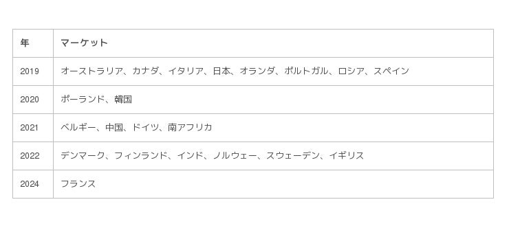 (※)米国を除き、ライブ放送は地域別の権利が施行される日程に沿って行われます。全てのマーケット(米国以外)は 2024年まで PGA TOURとの戦略的パートナーシップを通じて Discoveryによって運営されます。地域別の権利が施行される日程は以下の通りです。