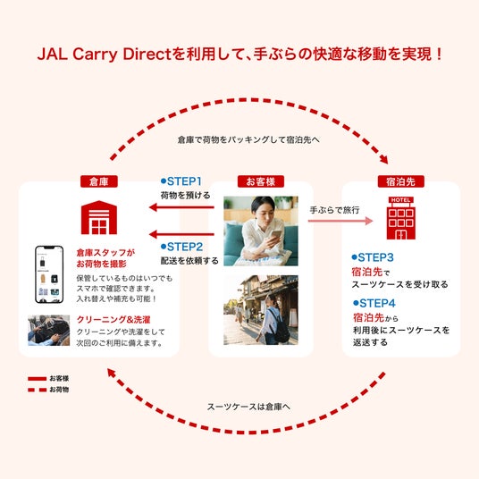 日本航空株式会社(本社:東京都品川区、代表取締役社長:鳥取三津子、以下「JAL」)と株式会社エアトランク(本社:東京都千代田区、代表取締役:福岡英成、以下「エアトランク」)は、荷物の保管・荷造り・配送のトータルサービス「JAL Carry Direct」の提供を4月8日(火)より開始します。