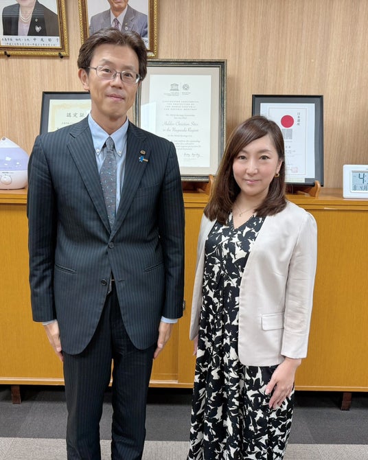 2025年8月、五島支店開設に際し五島市役所を訪問。左から五島市長 出口 太氏、Beyond代表 道越万由子。