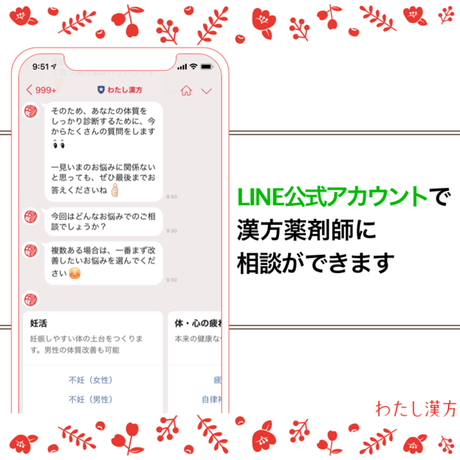 『わたし漢方』は、LINEで身体の悩みを薬剤師に相談すると、自分にあった漢方薬を自宅に配送してくれるオンライン漢方相談サービスです。カウンセリングはすべてLINE上で行い、最初の問診は24時間相談可能。漢方の専門家が直接お悩みにお答えいたします。初回の問診はすべて無料。体質改善の相談と漢方薬の服用を希望する場合は有料プランとなります。漢方は貴重な天然資源からできているため、漢方薬局で購入すると2~6万/月ほどかかってしまうことがありますが、LINEでの相談に特化したことでどの処方も1万円台の月々定額制でより継続しやすくしました。また購入後も、体質の変化に合わせて随時LINEで薬剤師に相談ができ、漢方薬の変更も無料です。なんでもすぐに手に入る時代ですが、健やかなおからだだけは簡単に手に入りません。『わたし漢方』では、現代の女性が美しく健やかなからだを手に入れ、もっと自由に生きるためのお手伝いをしてまいります。