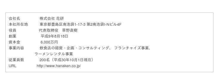 1998年2月、東京・池袋で創業して以来、濃厚な味の「豚骨醤油」、クリーミーで臭みのない「とんこつ」の日本柱のラーメンを提供し、多くのラーメンファンの皆様から絶大な支持をいただいております。キングオブトッピングと名高い角煮も人気を集めております。現在、首都圏を中心に国内29店舗 海外9店舗 合計38店舗を展開しております。