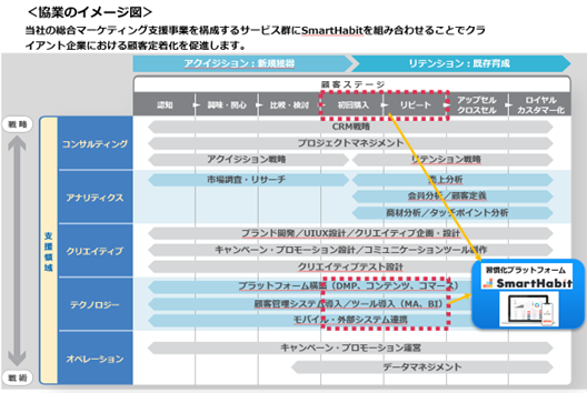 クライアント企業が抱える、顧客マーケティングに関わるあらゆる業務を伴走型で支援する、マーケティングパートナーとしての当社の強みと、サービスや商品利用の定着化・習慣化プラットフォームを持つWizWeとは、互いの強みを補完し合うことで大きな相乗効果が期待できると判断し、この度の資本参加を決定いたしました。