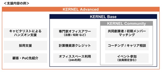 起業やスタートアップのCxOを目指す方々の準備段階に応じて、「KERNEL Advanced」「KERNEL Base」「KERNEL Community」の3つのメンバーシップを設け、それぞれに最適な支援を提供します。