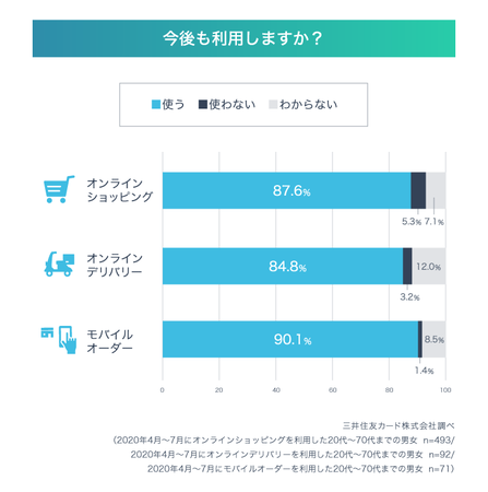 今回は各種オンラインサービスの利用について調査を実施。自宅にいながらにしてネットでさまざまな買い物ができる「オンラインショッピング」を利用した人は78.4%、食べ物をネットで注文して家まで届けてもらう「オンラインデリバリー」を利用した人は15.7%、またスマートフォン等からあらかじめ商品を注文・決済しておき、店舗で商品を受け取る「モバイルオーダー」を利用した人は10.6%でした。これ以下はこの3種類のサービスで何らかのキャッシュレス決済を用いて利用した20代~70代の男女500人に、利用頻度やこれらのオンラインサービスの利用が、去年より増えたのかどうかなどについて調査しました。