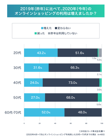 オンラインショッピングの利用頻度は去年と比べてどう変化したのでしょうか。コロナ禍で消費全体が落ち込んでいた中でも、オンラインショッピングの利用は全体で36.6%、約3人に1人が増えたと回答。年代によって差がありますが、最も利用が増えたと回答したのは、60~70代の高齢者層で52.0%(約2人に1人)、次に増えたのが、20代という結果になりました。