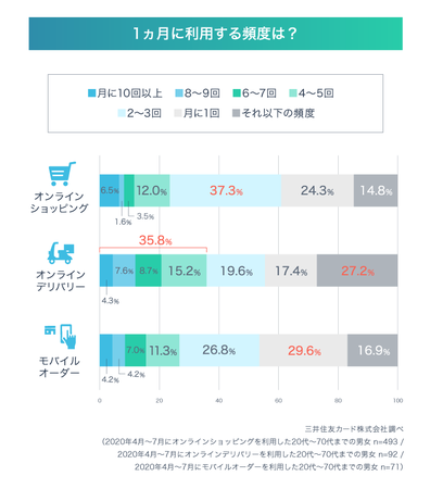「オンラインショッピング」は、月に2~3回以上利用しているという人が最も多く、37.3%でした。出前感覚で料理の宅配を楽しめる「オンラインデリバリー」は月1回以下の利用が多いのですが、ほかのサービスに比べて月4~5回以上頻繁に利用している人も35.8%存在。また事前にスマートフォンで注文・決済しておいた商品を自分で受け取りに行く「モバイルオーダー」も月1回の利用が最も多く、29.6%という結果になりました。