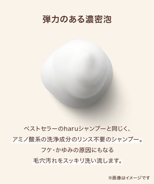 『泡』の力。アミノ酸系ベースのマイルドな洗浄力頭皮への刺激も考慮したアミノ酸系ベースで、洗浄力はマイルドかつ弱酸性。きめ細かな濃密泡が頭皮をやさしく包み込み、摩擦を防ぎながら洗い上げます。洗髪後のつっぱり感も抑え、乾燥やカラー後の敏感な頭皮にも使いやすい設計です。「泡で包み込まれる」ような感覚が、心地よさと安心感をお届けします。