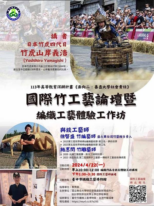 竹虎四代目が台湾時間2024年4月22日(月)に台湾の台中繊維工芸館で開催される国際竹工芸フォーラムにて講演をすることが決定しました。