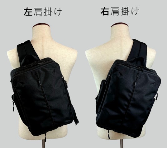 ショルダーの取り付け位置をワンタッチで簡単に付け替えることができ、右掛け・左掛けどちらにも対応します。