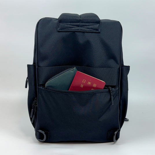 一方、ブランドロゴの付いた前面側には、大きめのファスナーポケットを配置。
