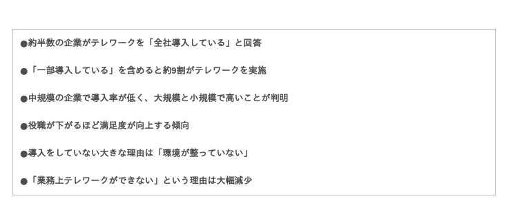 経営層の意思が変化したことや感染拡大が急速に進んだこと、IT技術の進歩でテレワークがより円滑に可能になったこと、加えて政府からの要請などによって考えが変化してきているのではないかと推測されます。