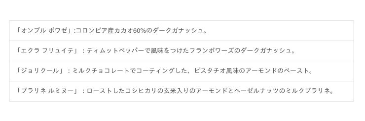 コンフィズリーの味わいを基調としたブシェの詰合せ。とろけるようだったり、カリッとしていたり、フルーティーだったり、サクサクしていたり。中央にはイチゴ風味のハート型のチョコレートが収められています。さまざまな喜びと味わいと感動が交錯する4つのレシピは、心に秘めた思いを形にした、大切な人と一緒に味わいたいショコラです。