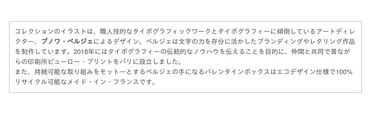 コレクションは、4種の限定レシピを収めた3サイズ展開のギフトボックスと、パズルのような曲線を描く3種の中心にハート型のチョコレートが収まった4種のブシェの詰合せで構成されています。これらに加え、毎年人気のハート型のボックスに収めた「ハート ギフトボックス」2サイズや、限定デザインスリーブ付きのボックスには、タブレット デマントを4種詰合せた「タブレット ボックス」とマカロンボックス2サイズを展開。