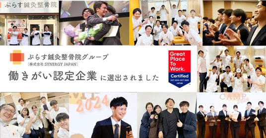 『患者様「0」の社会を創る』をビジョンに掲げ、日本全国で63店舗となるぷらす鍼灸整骨院を運営する株式会社SYNERGY JAPAN(本社:大阪市北区、代表取締役:高階耕治、以下、SYNERGY JAPAN)は、Great Place To Work(R) Institute Japan(本社:東京都港区、代表取締役社長:荒川 陽子、以下、GPTW Japan)が実施する「働きがいのある会社」調査で、2025年版「働きがい認定企業」として認定されたことをお知らせいたします。なお、医療・福祉業種のなかで、鍼灸整骨院としてはSYNERGY JAPANが唯一の認定企業となります。(2024年11月時点)
