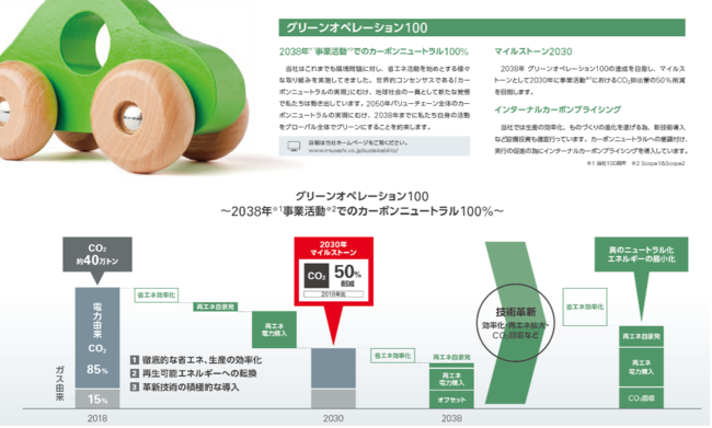 サステナビリティ戦略では、創業100周年に当たる2038年に事業活動(※1)でのカーボンニュートラル100%を掲げています。このたび、新たに中間目標となる「マイルストーン2030」を策定・公表いたしました。徹底的な省エネ・生産の効率化、再生可能エネルギーへの転換や革新技術の積極的な導入などにより、2030年に事業活動におけるCO2排出量の50%削減を目指します。