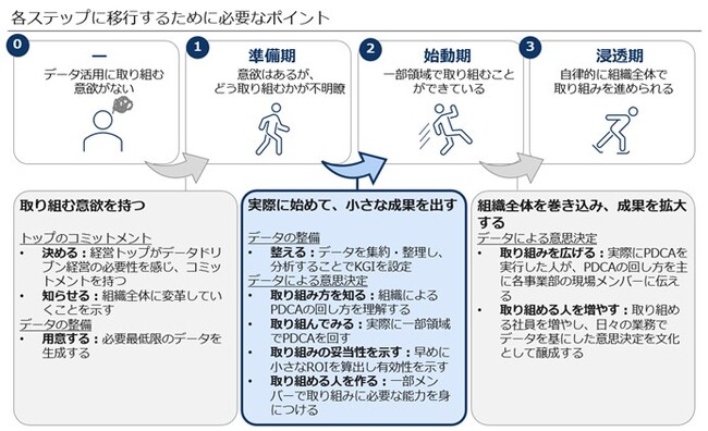 データ時代にふさわしい生産性を持つ企業にアップグレードするためには、データを基に、精度の高い意思決定をし、事業を発展させるデータドリブン経営が必要です。その実現までには、大きく分けて、3つのステップがあり、それは1.トップのコミットメントから始まる「準備期」、2.データの整備がされ、一部組織がデータによる意思決定ができるようになる「始動期」、3.自律的に全組織がデータによる意思決定ができる「浸透期」です。