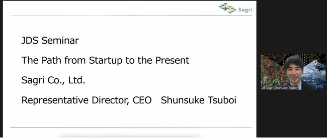 「人類と地球の共存を実現する」をビジョンに掲げ、活動を行うスタートアップ企業サグリ株式会社は、2021年3月28日、JICA(国際協力機構)が主催する人材育成奨学計画(通称JDS事業)における付加価値研修に参加をし、ネパール及びガーナの修士課程留学生20名に対して、「創業から今に至るまでの軌跡」を題とした45分間に渡るプレゼンテーション(言語は英語で実施)の実施をご報告致します。