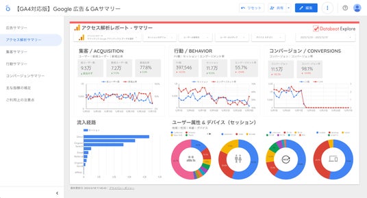 Google広告のサマリーと一緒に、GA4の「集客」「行動」「コンバージョン」に関するデータを、こちらのテンプレートだけで確認できます。