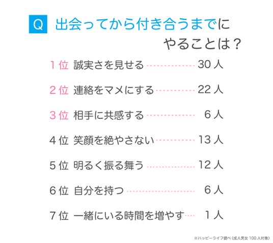 『出会ってから付き合うまでにやること』を聞いてみたところ、『誠実さを見せること』と回答した人が約3割でした。