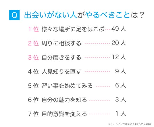 他にも、『自分磨きをする』『人見知りを直す』という回答がそれぞれ1割を占めており、自分自身を変える行動が必要と考える人もいるようです。