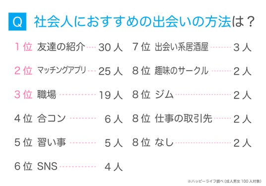今回の記事では、累計会員数3500万(※1)を誇る出会い・恋愛マッチングアプリ・サービス「ハッピーメール(https://happymail.co.jp/)(運営:株式会社アイベック 本社:福岡県福岡市)」にて、社会人の男女100人を対象に、『社会人の出会いの場』に関連するアンケート調査を行いました。