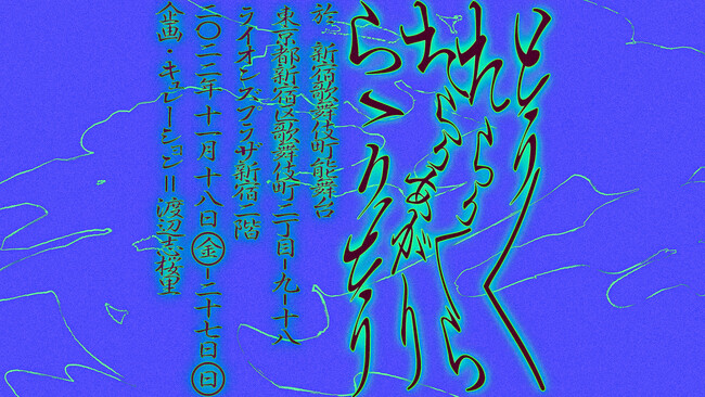 内容:「とうとうたらりたらりらたらりあがりららりとう」は『翁』の冒頭の謡であり、この謎めいた謡の詞章が、本展覧会の総タイトルである。「『翁』の宇宙論をベースにエコロジーや生態系を再定義する展示」をコンセプトに、19日には梅若桜雪師の『翁』(神歌)、26日には梅若桜雪師がシテを勤めた新作能『不知火』を取り上げる。
