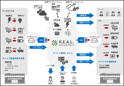 今回は実証の第二弾として、ネットスーパー用宅配車両にEV車を導入し、AI(強化学習)による最適なエネルギーマネジメントを行うことで「エネルギー×モビリティ×AI」によるラストワンマイル物流の脱炭素化を目指します。「R.E.A.L. New Energy Platform(R)」のAI(強化学習)が、宅配スケジュールやEVの電池残量、及び店舗の太陽光発電量・電力消費状況・蓄電池残量等を逐次学習した上で各機器を自動制御。宅配時以外はEVも店舗用の蓄電池として活用し、最適な充放電管理(エネルギーマネジメント)を行います。実証実験を通じ、店舗運営・宅配業務いずれの快適性と運用性も損なわない形で、CO2排出量及びエネルギーコストの削減を実現します。
