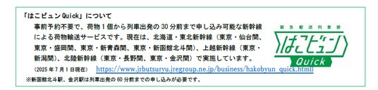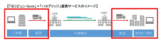 株式会社ジェイアール東日本物流(本社:東京都墨田区、代表取締役社長:野口忍、以下「ジェイアール東日本物流」)と株式会社ルーフィ(本社:東京都中央区、代表取締役社長:渡辺 泰章、以下「ルーフィ」)は、2025年7月1日よりジェイアール東日本物流が提供する列車荷物輸送サービス「はこビュンQuick」とルーフィの車両マッチングサービス「ハコブリッジ」が連携した即日輸送サービスを開始します