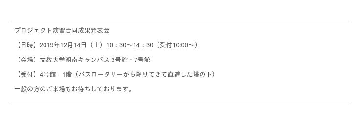 文教大学は、12月14日(土)、湘南キャンパスにて情報学部情報システム学科の学生による「プロジェクト演習合同成果発表会」を開催します。