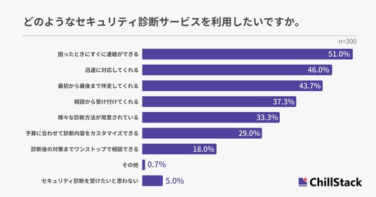 どのようなセキュリティ診断サービスを利用したいか尋ねたところ、「困ったときにすぐに連絡ができる」が51.0%で最も多く、「迅速に対応してくれる」が46.0%、「最初から最後まで伴走してくれる」が43.7%と続きました(n=300)。