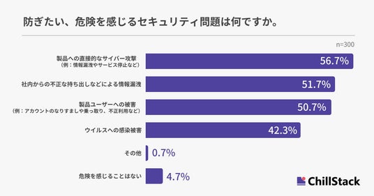 防ぎたい、危険を感じるセキュリティ問題について尋ねたところ、「製品への直接的なサイバー攻撃」が56.7%で最も多く、「社内からの不正な持ち出しなどによる情報漏洩」が51.7%、「製品ユーザーへの被害」が50.7%と続きました(n=300)。
