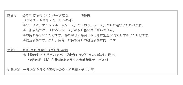 発売を記念して、「松のや ごちそうハンバーグ定食」をご注文のお客様に限り、12月25日(水)午後3時までライス大盛を無料サービスいたします。