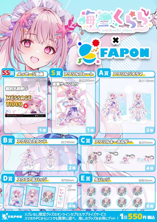 VTuber事務所として初となる自社オンラインくじ『FAPON』にて、910inc専属バーチャルYouTuber海星くららがタイアップを展開。