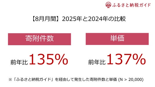 主要23サイトを横断比較できる「ふるさと納税ガイド」は2025年9月末のポイント付与廃止の影響を調べるため、2025年8月の寄付件数と寄附単価の前年比(自社サイト経由)を発表します。