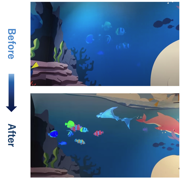 マックスバリュ関東が、2022年6月にリニューアルオープンした『マックスバリュ木更津請西店』では、「木更津の海」をモチーフにした、家族が一緒に楽しめるイートインスペース「Cafe&Dine/カフェアンドダイン」の壁面に描かれた海の中に、まるで実際の水族館にいるような臨場感のある映像表現をプロジェクションマッピングによる海の生き物たちのアニメーションにて実施してきました。