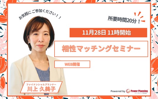 無料マネーセミナー提供サービス「アットセミナー」を運営しているパワープランニング株式会社が「11月28日(木) 11時」に川上 久美子講師によるオンラインの相性マッチングセミナー開催を実施いたします。