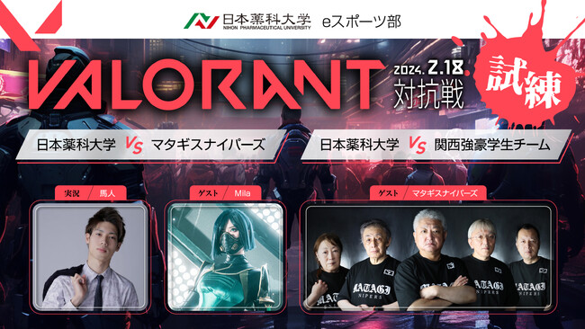 日本国内で薬科大学初のeスポーツ部として創部した日本薬科大学のeスポーツ部は2024年2月18(日) 『試練』VALORANTと第三回APEX LEGENDS 全日本オープンを開催します。VALORANT試練では、日本薬科大学代表チームが、秋田のマタギスナイパーズと関西の強豪学生eスポーツチームと対戦。第三回APEX LEGENDS 全日本オープンでは、参加チームをつのり、カスタムマッチ3戦を行います。