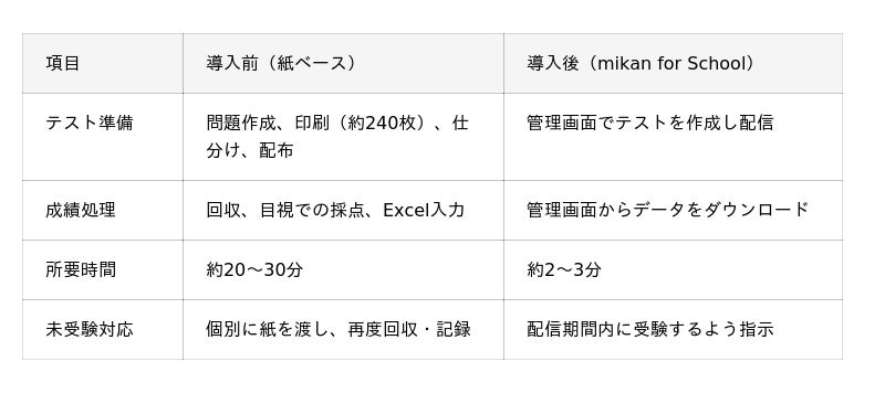 毎週の小テスト運営にかかる時間が、20~30分から2~3分へと劇的に短縮されました。