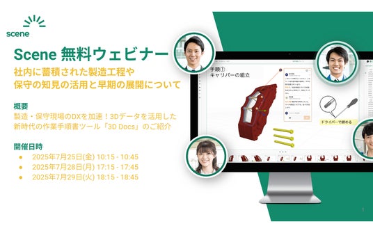 『革新者を力づけ、物理世界の変革を加速する』をミッションに、ものづくりのワークスペース「Scene Workspace」を開発・提供するScene株式会社(代表取締役 ビジャヤン・スワティナト 本社:東京都渋谷区)は、製造工程や製品保守における「手順書作成の非効率性」や「技術伝承の課題」を解決する新世代の作業手順書ツール「3D Docs」に関する無料オンラインウェビナーを2025年7月25日(金)より開催します。