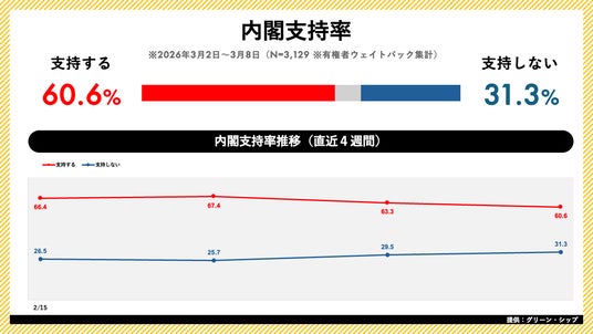 高市内閣の支持率は60.6%(前週比-2.7pt)となりました。