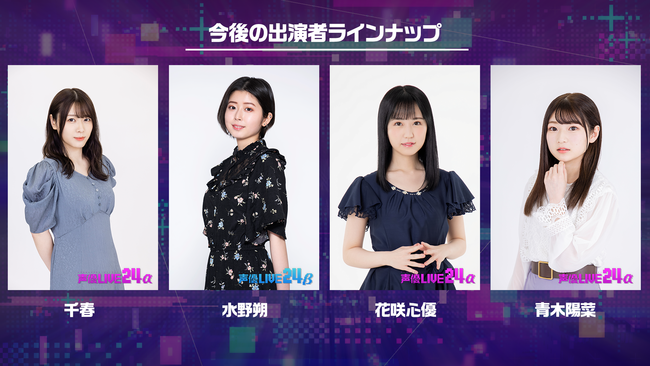 「声優LIVE24」には「α」と「β」の2タイプの番組が存在。「声優LIVE24 α」は今後活躍が期待される新人声優達が活躍するフレッシュなLIVE配信番組をお届け!「声優LIVE24 β」は今活躍している声優がデジタル空間で様々な企画やコーナーにチャレンジする2次元と3次元のハイブリッド番組となります。