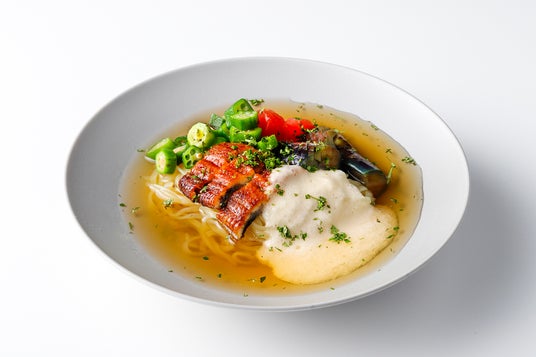 新鮮な「夏野菜」と土用丑の日の「鰻」にたっぷりとろろをかけた、シーズナルな冷麺。とろろと麺をよく絡ませて、お召し上がりください。