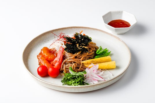 「カンジャンセウ」は韓国の醬油漬けにした海老のことで、「マッククス」は韓国の江原道地域の郷土料理の蕎麦粉で作った麺のことを言います。冷たく冷やした麺を、韓国の醬油漬けの海老や薬味と一緒に、酸味のある甘辛ソースを加えて、よく混ぜてお召し上がりください。