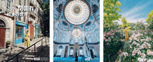 残念ながら3月末に閉館が決定している「星の王子さまミュージアム」は、園内すべてが絵本のような写真が撮れる場所として人気に。トルコ文化に浸れる寺院「東京ジャーミイ」、英国式庭園「横浜イングリッシュガーデン」などは異国情緒が漂うスポット。さらに、スポットの世界観や色彩に合わせて、ファッションにもこだわるのが「空間映え」のコツ。