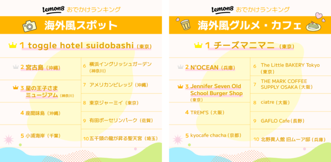 ライフスタイル共有アプリ「 Lemon8(レモンエイト)」は、Z世代向けに春の旅行先アンケート調査を実施し、加えて直近3ヶ月に位置情報をつけて投稿された約2万件の投稿を分析しました。その両方の結果を元に、「海外風スポット」「海外風グルメ・カフェ」の2つのテーマを選出し、各ランキングTOP10を発表します。