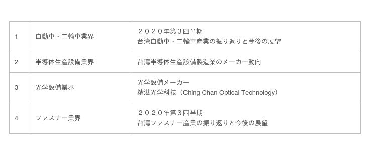 ワイズコンサルティング グループ(本社:中華民国台北市、代表取締役:吉本康志)は台湾機械業界専門誌「ワイズ機械業界ジャーナル」の12月第3週号を発行しました。今週号では、自動車・二輪車業界、半導体生産設備業界、光学設備メーカーの精湛光学科技(Ching Chan Optical Technology)、ファスナー業界について紹介します。