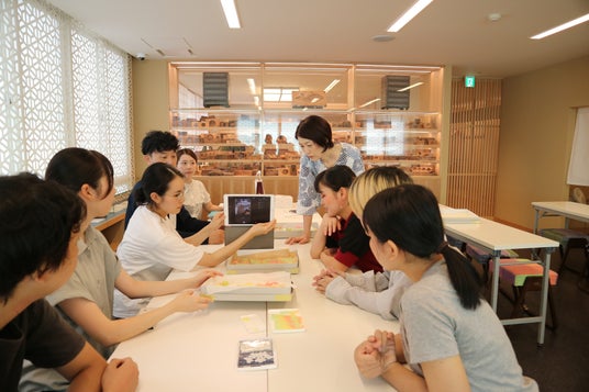 京都市立芸術大学の学生さんに、和菓子と染織についての座学・体験をしてもらい、そこから生まれたデザイン・アイデアを元に試作を重ね、新しいコンセプトの「京干菓子 浮き寄せ」が完成しました。