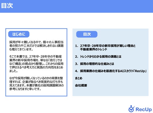本資料では、激化する不動産業界の新卒採用市場において、いま選ばれる企業は何が違うのか。RecUp導入企業が実践する、最新トレンドを捉えた戦略的スカウト運用の全容を公開します。